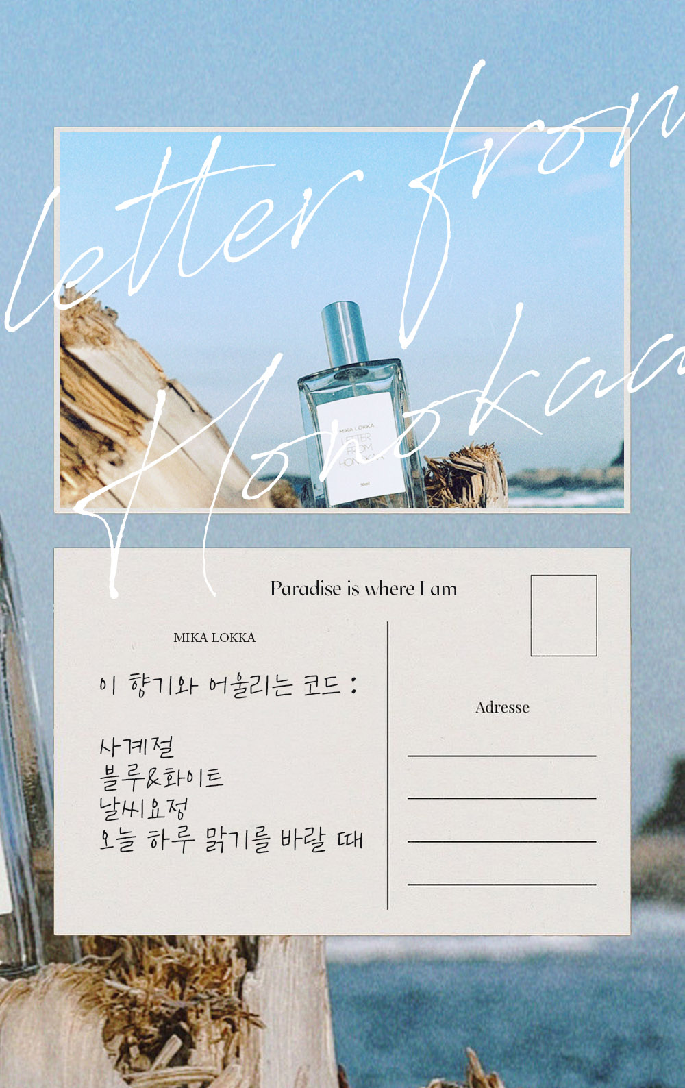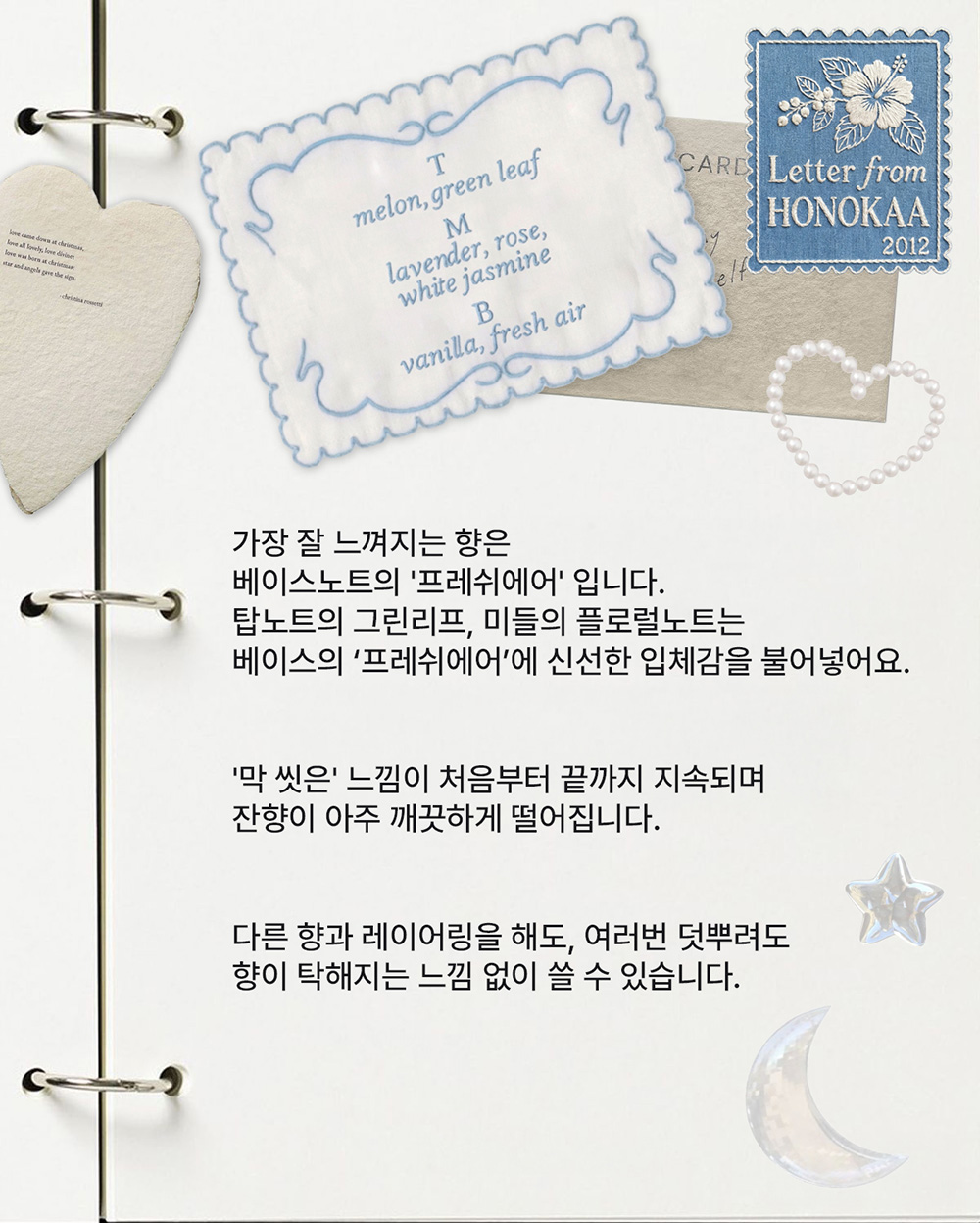 그 중 '막 씻은 느낌' '막 걷은 빨래를 잘 다려 입은 느낌'과 특히 잘 어울리는 계절은 단연 여름을 꼽을 수 있겠고요. 여름에는 너무 무거운 향이나 달콤한 향이 부담스럽잖아요. 땀 냄새 등을 커버해주고, 깔끔하고 깨끗한 이미지를 연출하는 데엔 미카로카의 향기 중엔 레터프롬호노카아를 가장 추천합니다.
